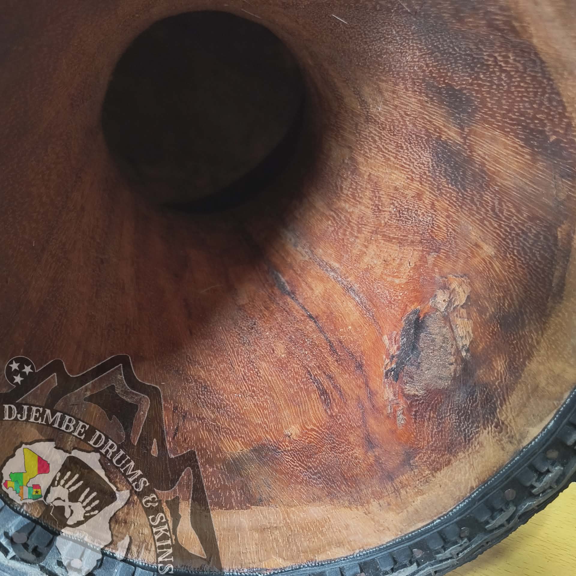 Discounted drums have minor flaws either in the carvings or stabilized knots or cracks, any such flaws will be shown in the pictures. These flaws have no effect on the tonal quality of the instruments.