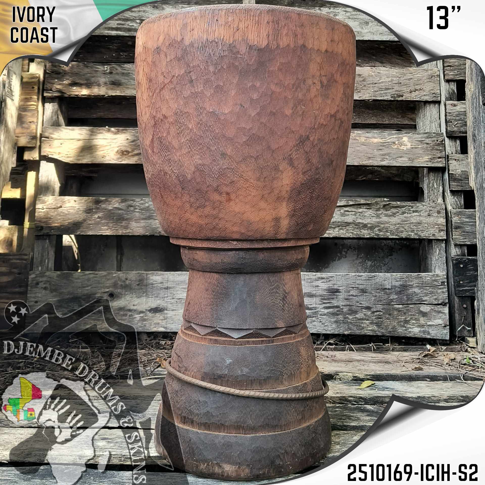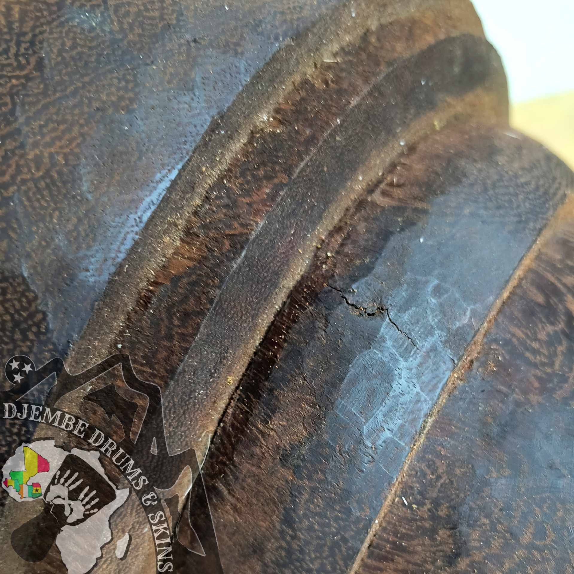 Djembe Shell hand carved out of a single log of Iroko Wood, finished with the traditional Ivory Coast chip pattern rather than the smooth lathe turned look.