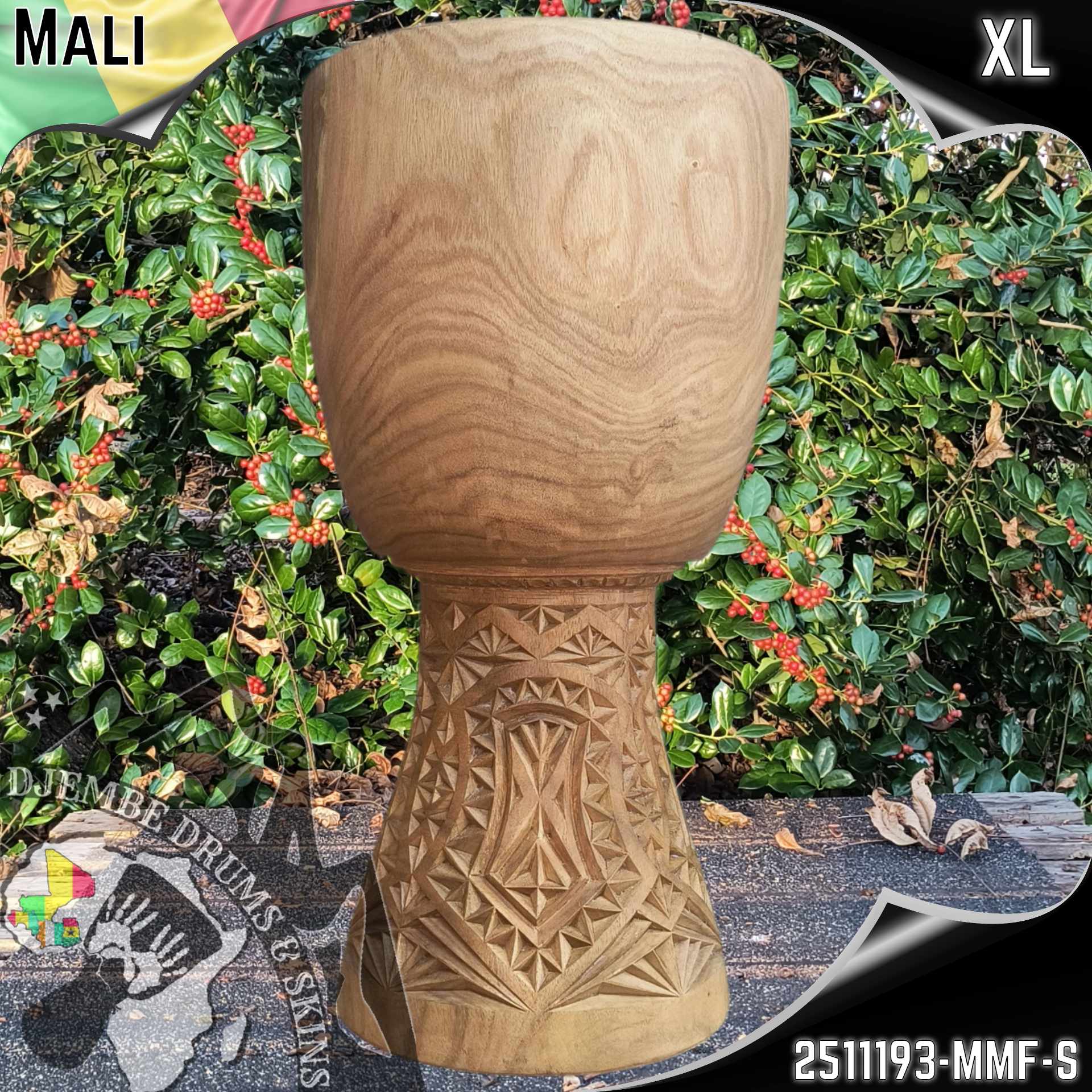 Premium XL Djembe Shell hand carved out of a single log of Melina Wood, that was dried/aged for between 6 months and 1 year to insure no premature cracking.