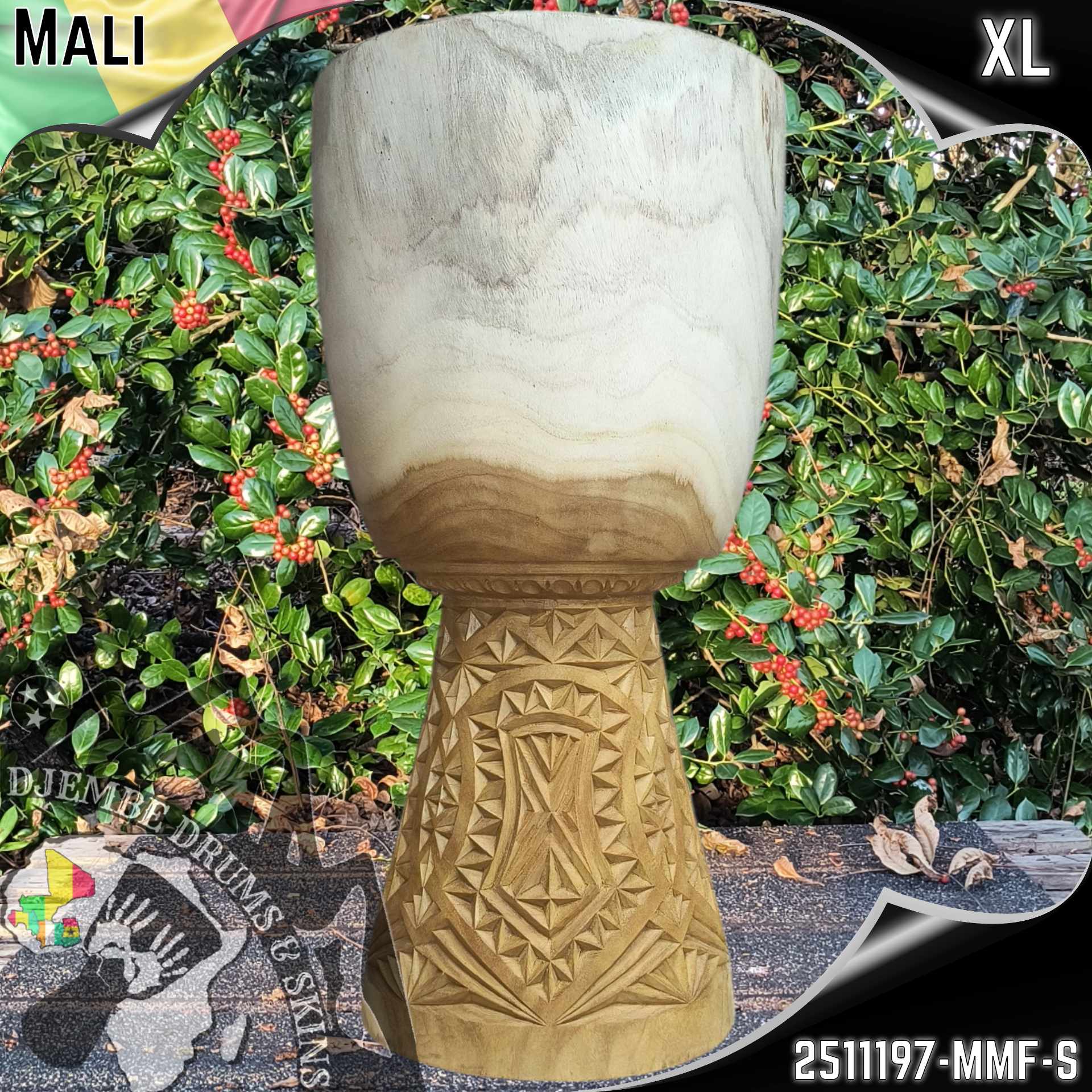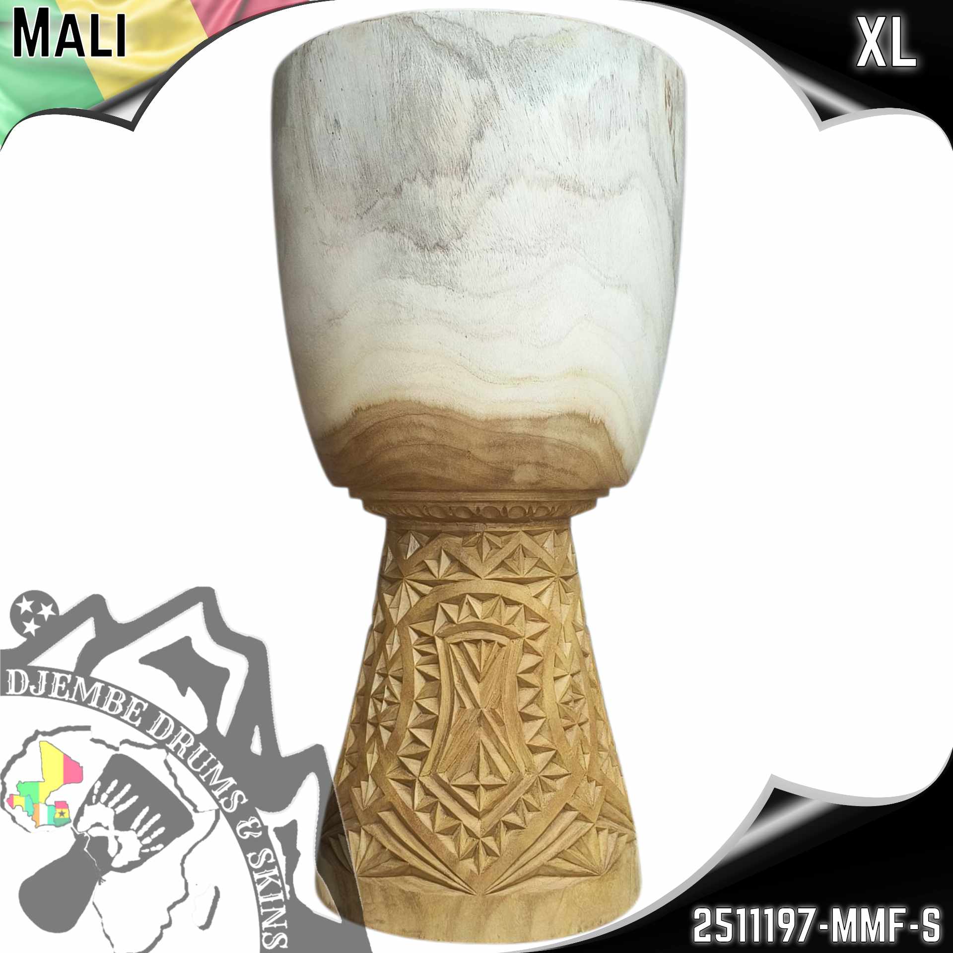 Premium XL Djembe Shell hand carved out of a single log of Melina Wood, that was dried/aged for between 6 months and 1 year to insure no premature cracking.