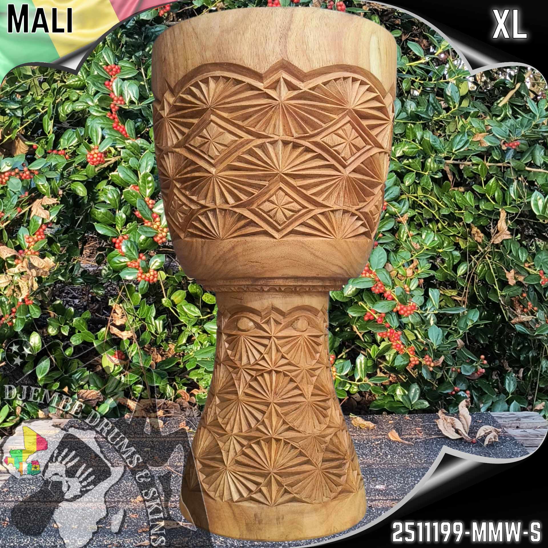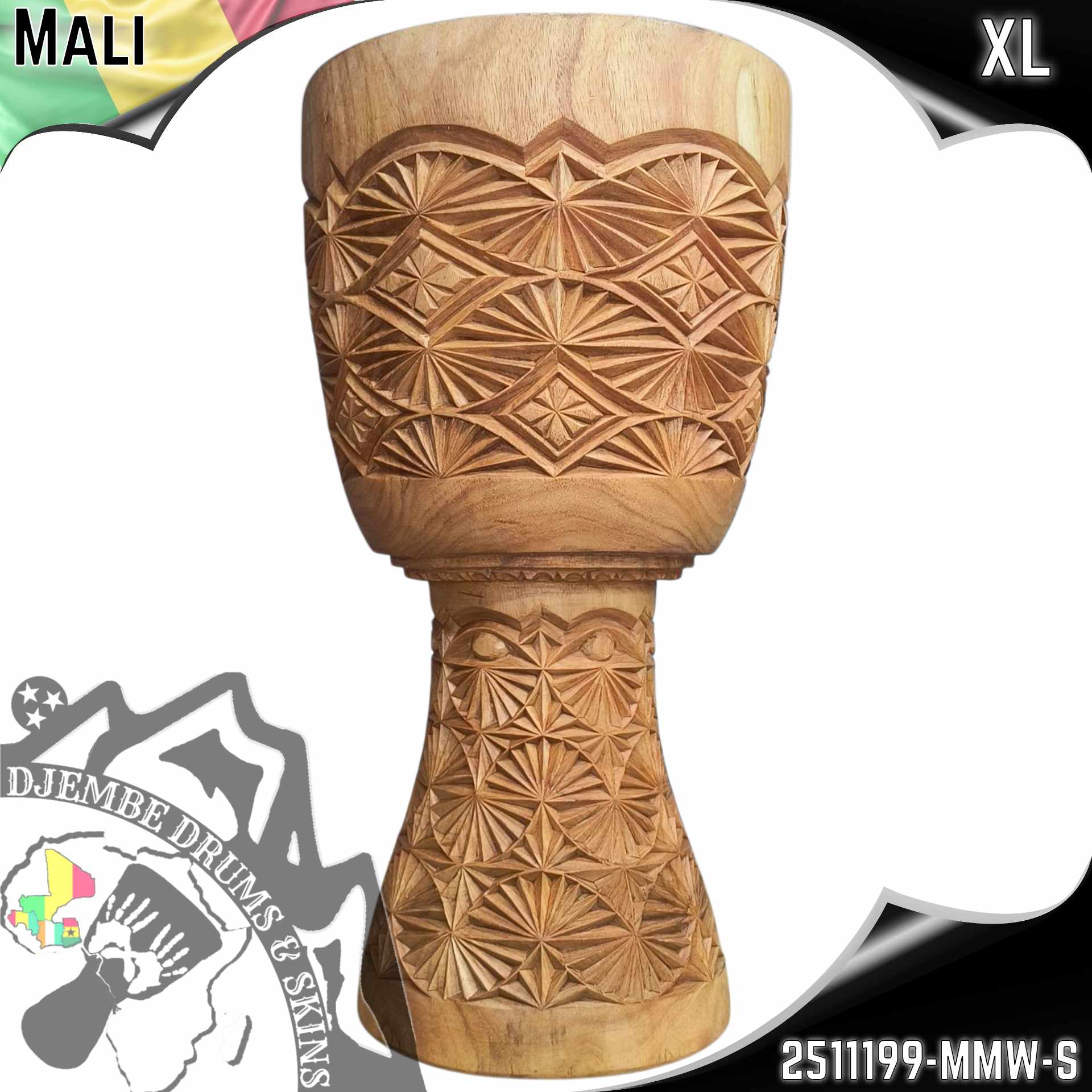 Premium XL Djembe Shell hand carved out of a single log of Melina Wood, that was dried/aged for between 6 months and 1 year to insure no premature cracking.