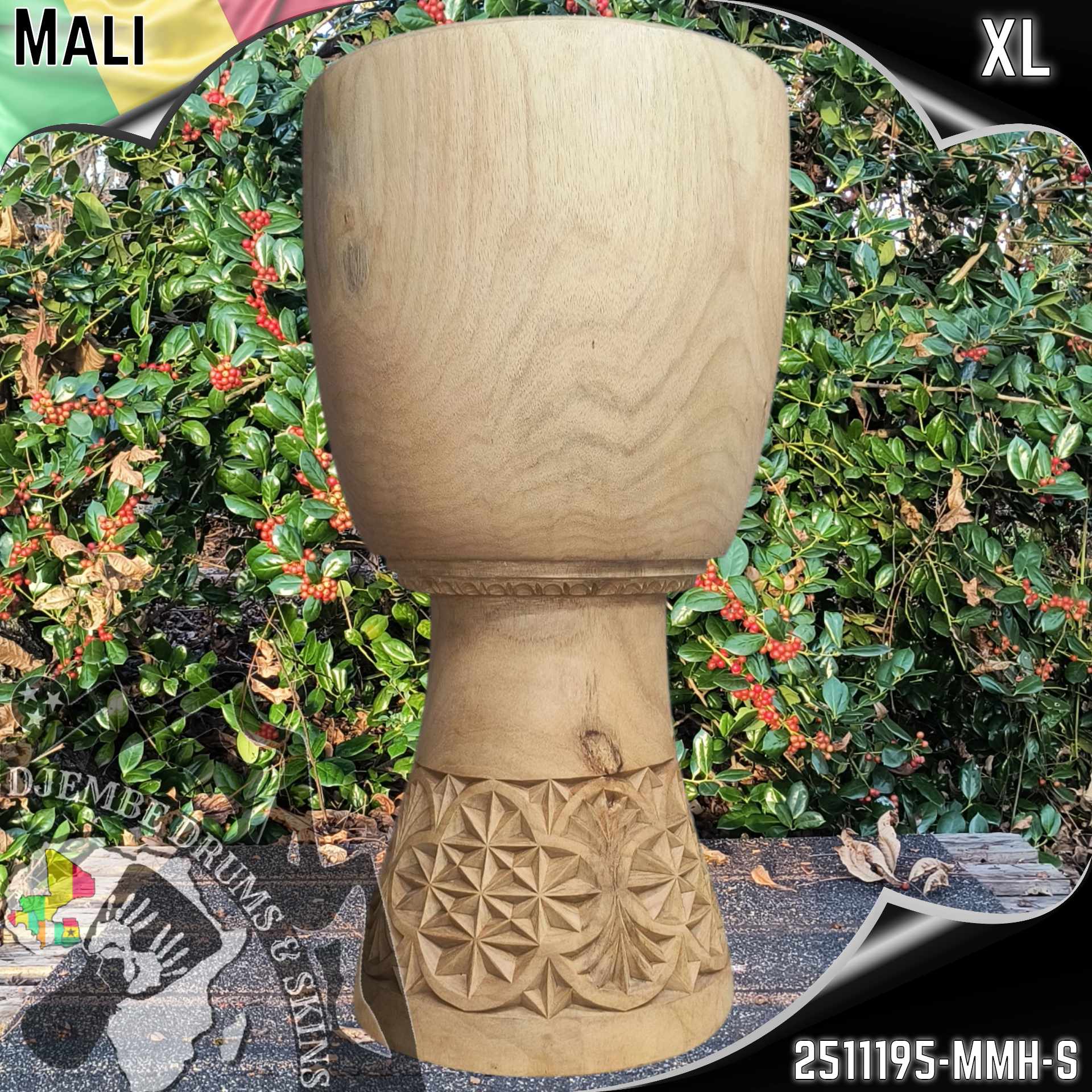 Premium XL Djembe Shell hand carved out of a single log of Melina Wood, that was dried/aged for between 6 months and 1 year to insure no premature cracking.